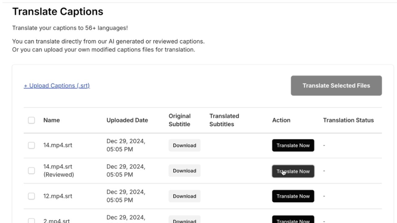 Need to reach a global audience? Upload your finalized transcripts/subtitles for instant translation into 56+ languages