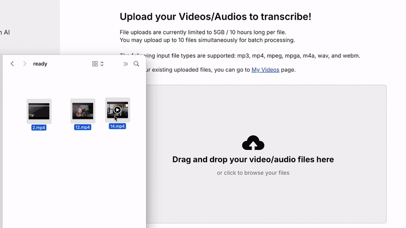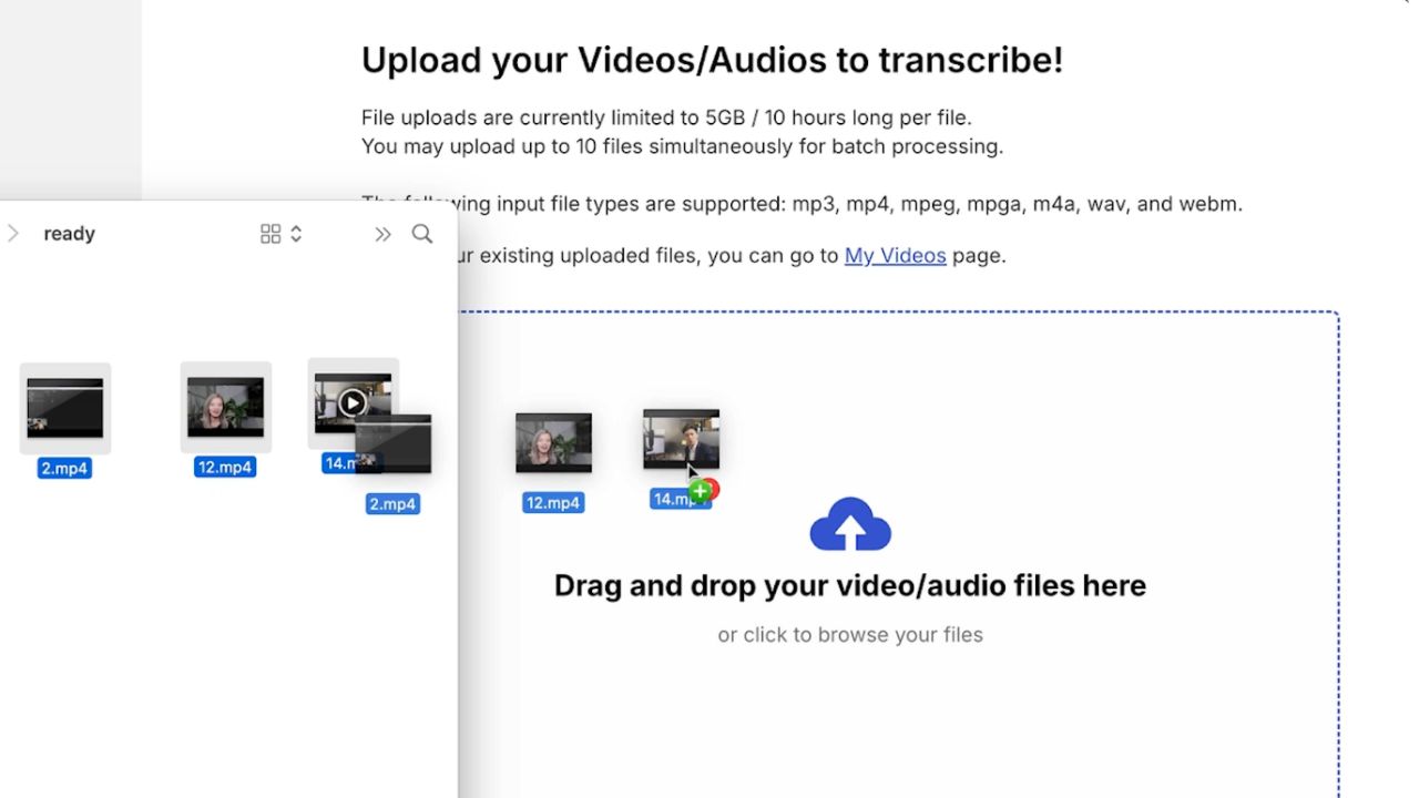 We support most common video and audio formats including: mp3, mp4, mpeg, mpga, m4a, wav, and webm. Maximum file size is 10GB per file for plus users.
