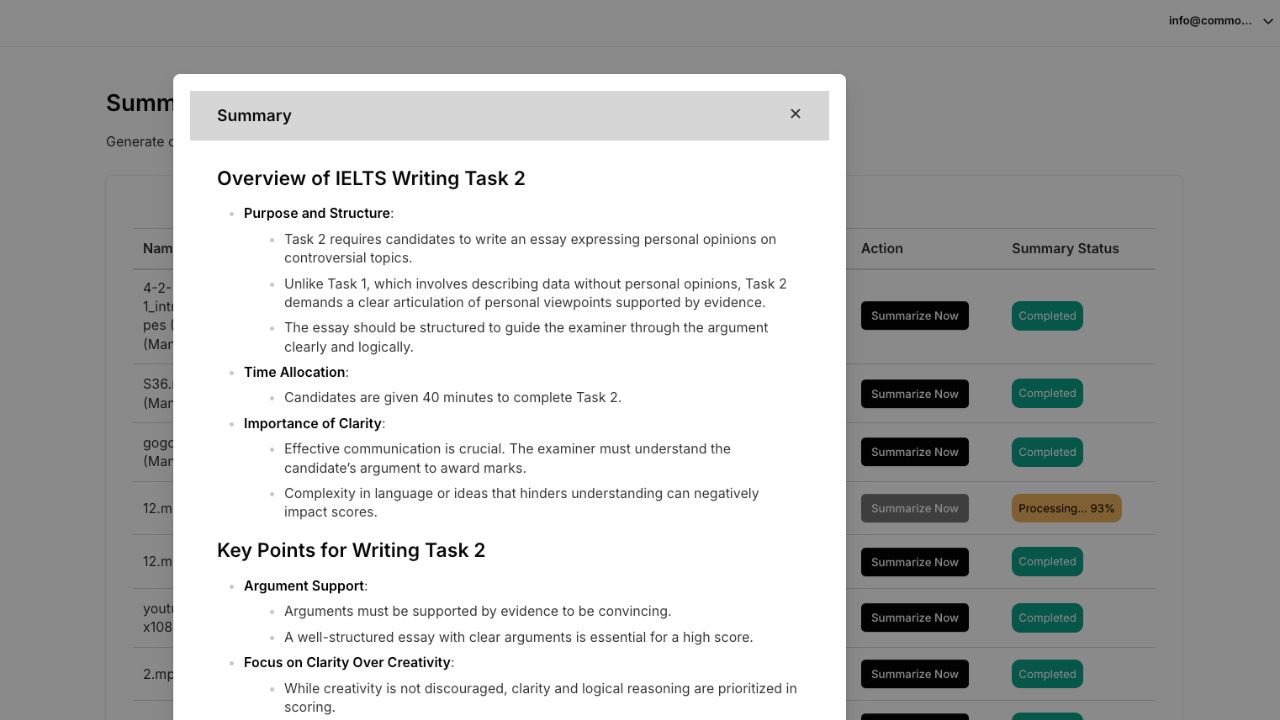 To summarize a transcript, first ensure your file is transcribed. Then, navigate to the Summarize page where you can generate a concise summary / key points of your transcript.